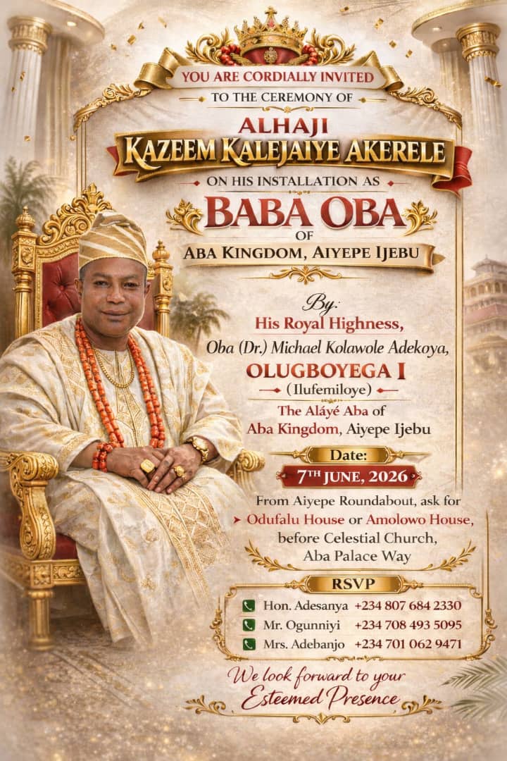 Aba ALHAJI KAZEEM KALEJAIYE AKERELE – BABA OBA OF ABA KINGDOM, AIYEPE IJEBU by agbewao 27 February 2026 written by agbewao 27 February 2026 0 comments 9 0 FacebookTwitterPinterestEmail agbewao previous post BASHORUN ADEWALE KASSIM AND YEYE BASHORUN ADEBIMPE KASSIM You may also like BASHORUN ADEWALE KASSIM AND YEYE BASHORUN ADEBIMPE KASSIM 27 February 2026 Alhaji Ade Olowosale – Happy Birthday 21 October 2024 HRH OBA EMMANUEL ADEYEMI ALABA DEINBO 14 October 2024 Alhaji Ademola Olowosale 1 September 2024 Lawyer Kay Ogunfeibo 1 September 2024 Evangelist Oladapo Adeosun 1 September 2024